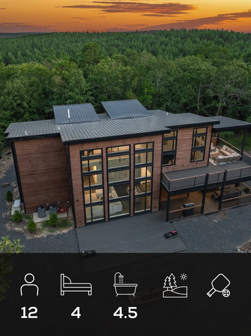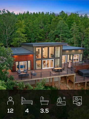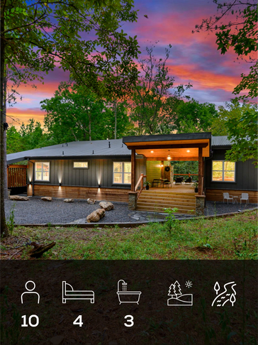Four-bedroom luxury cabin including a private detached king suite, elevated finishes, and a serene creek-side location.